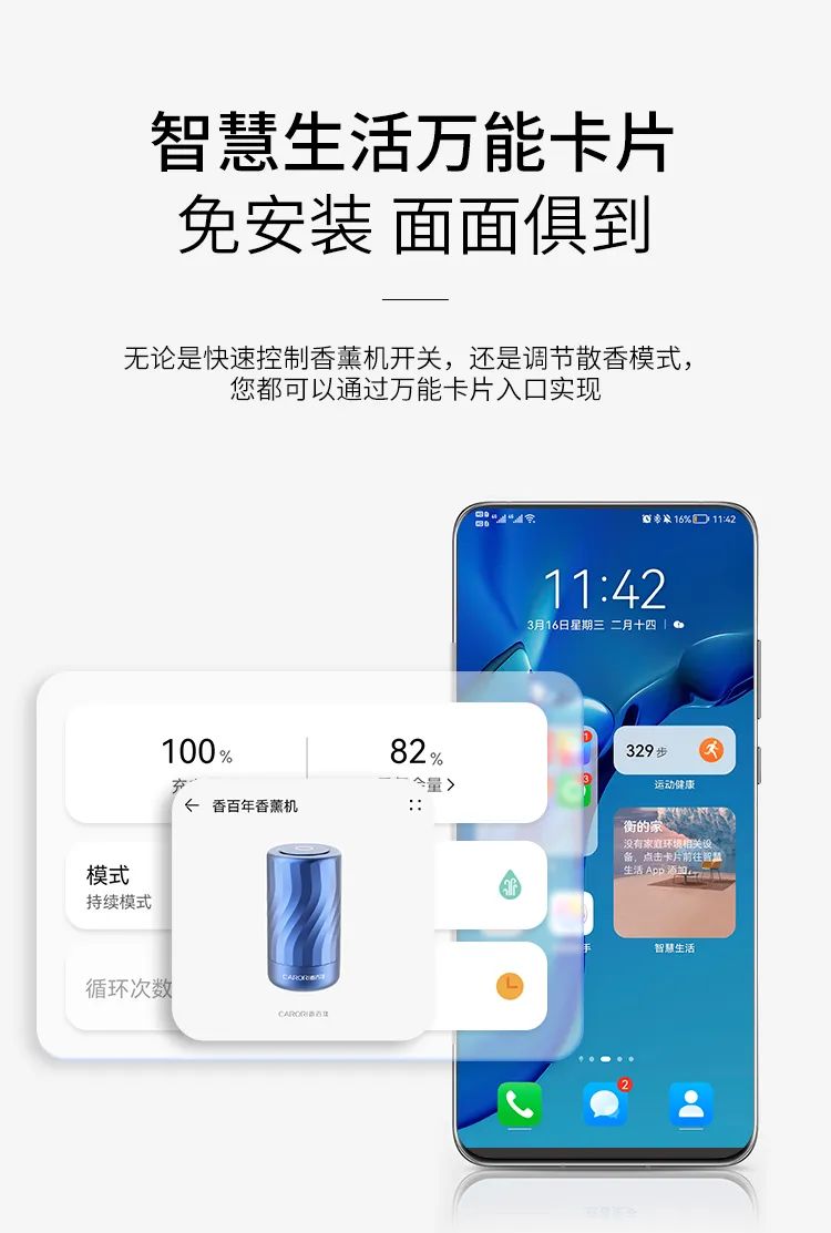 用手機(jī)連接香百年智能香薰機(jī)后,在HarmonyOS中上滑App圖標(biāo)即可生成萬能卡片,放置在桌面的任何位置,直接顯示信息。比如當(dāng)前模式、剩余電量、循環(huán)次數(shù)、持續(xù)時(shí)長等。